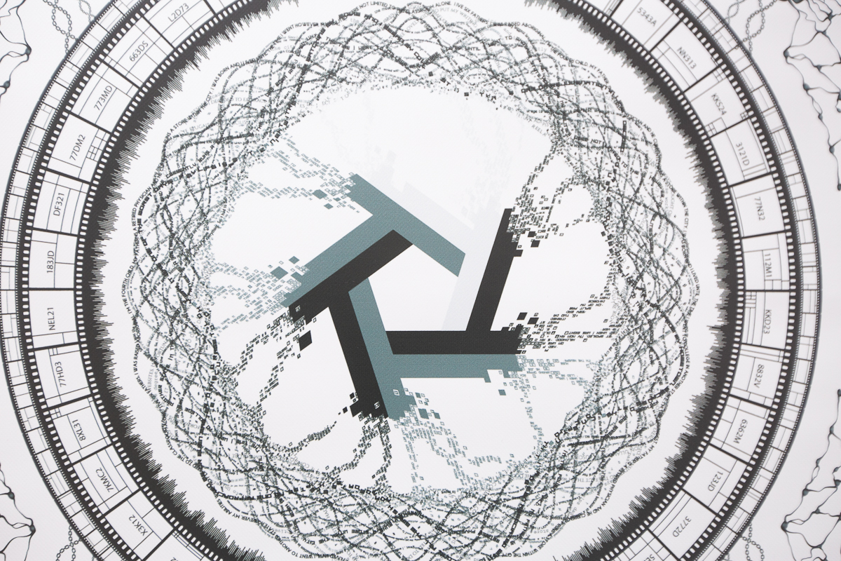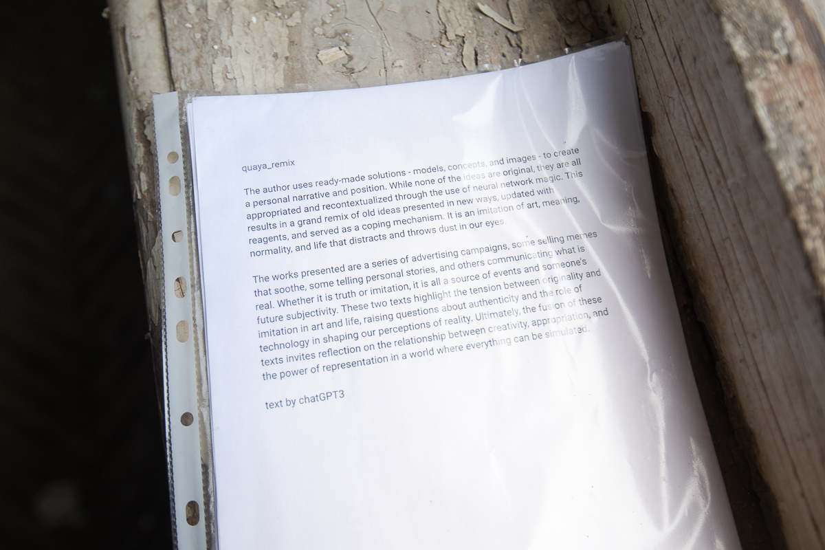 2023/ Chatgpt3, SD 2.0, midjourney v4, ad banners, white wall paint, black spray paint, mixed mediaThe author uses ready-made solutions - models, concepts, and images - to create a personal narrative and position. While none of the ideas are original, they are all appropriated and recontextualized through the use of neural network magic. This results in a grand remix of old ideas presented in new ways, updated with reagents, and served as a coping mechanism. It is an imitation of art, meaning, normality, and life that distracts and throws dust in our eyes.